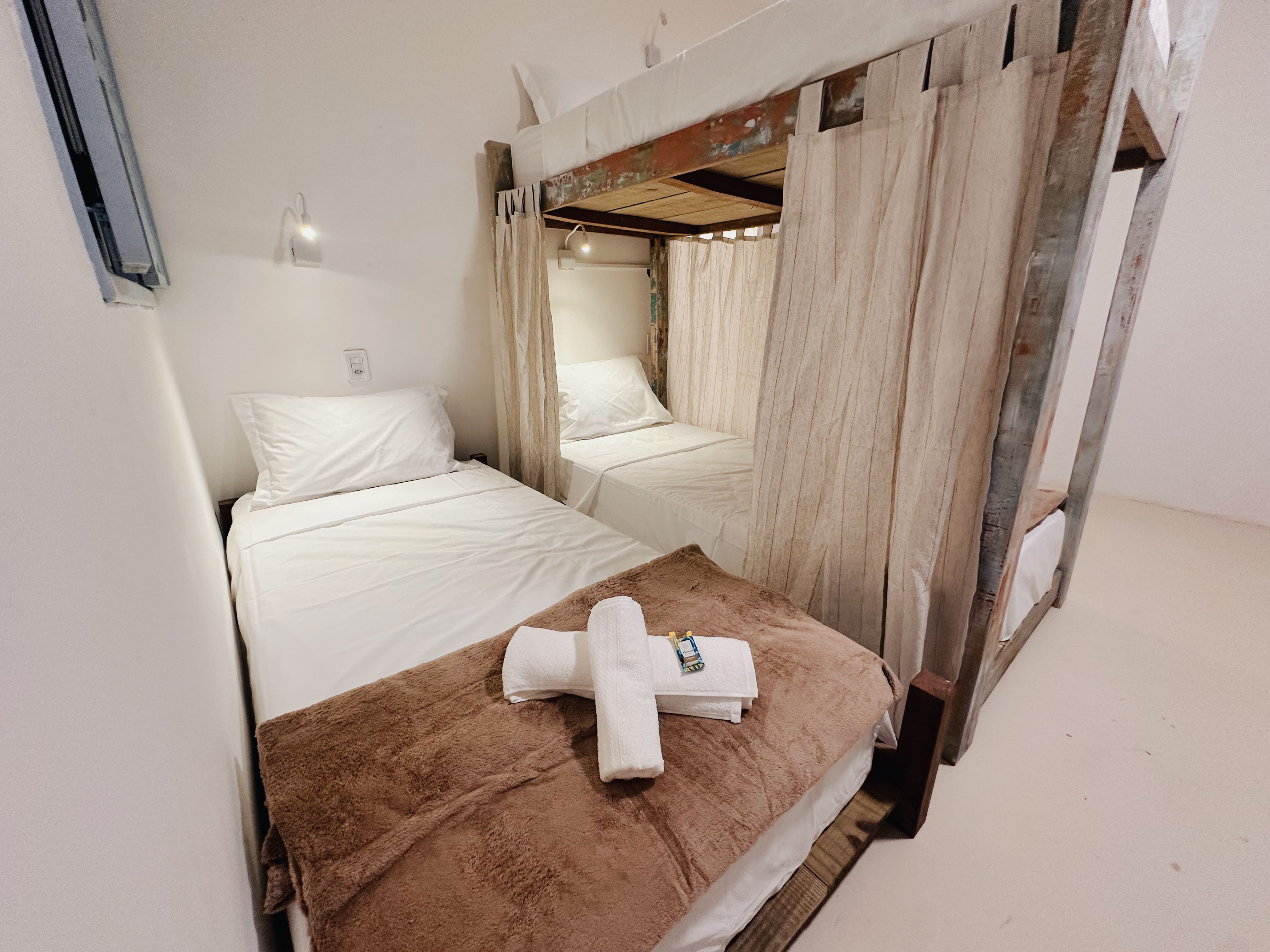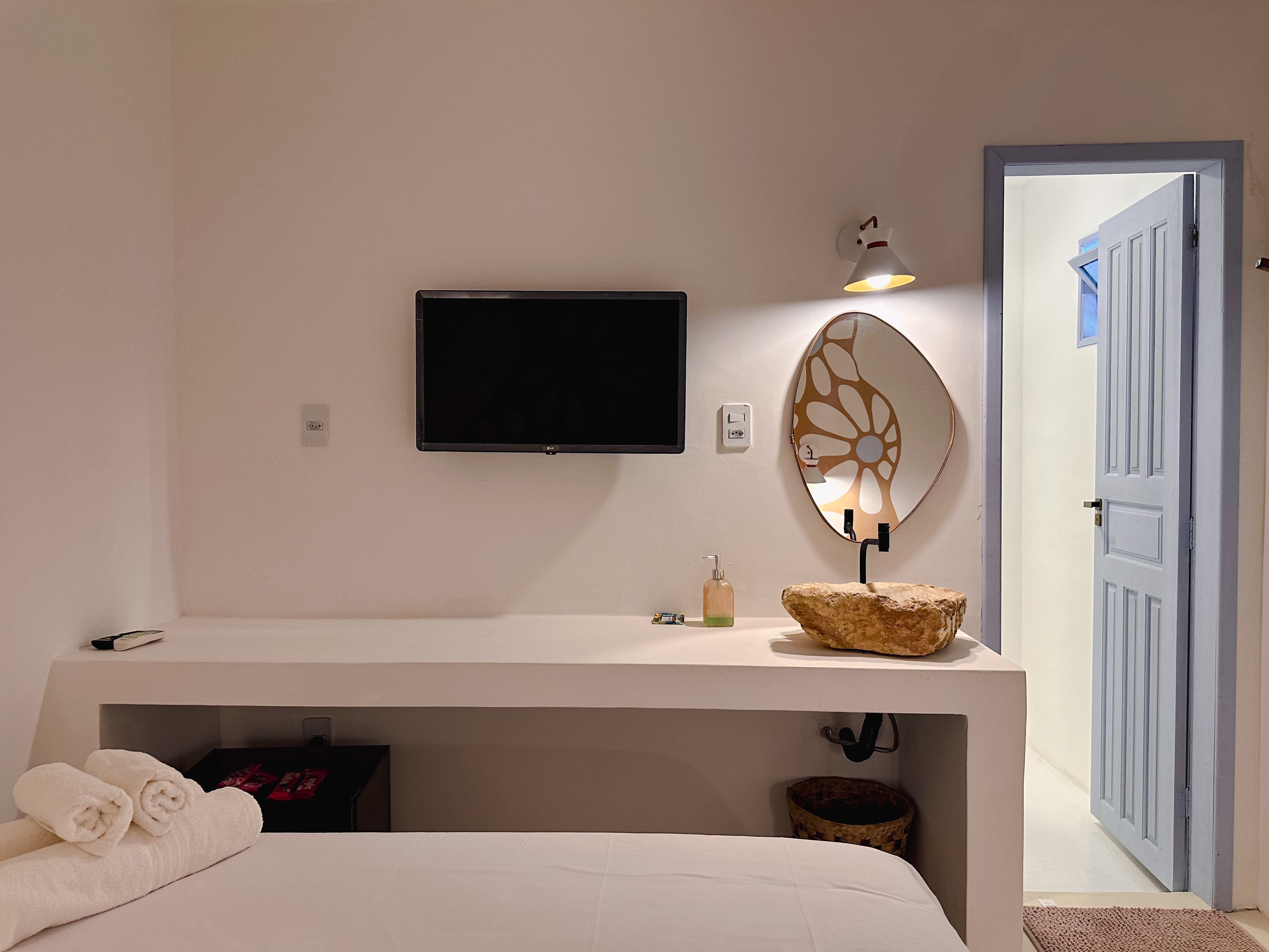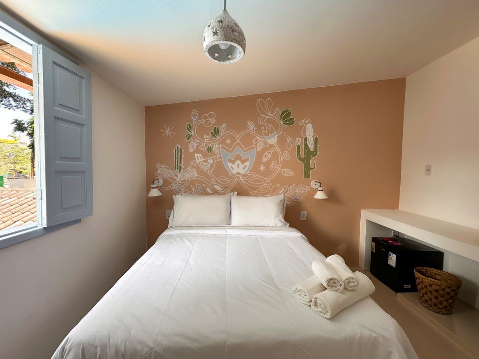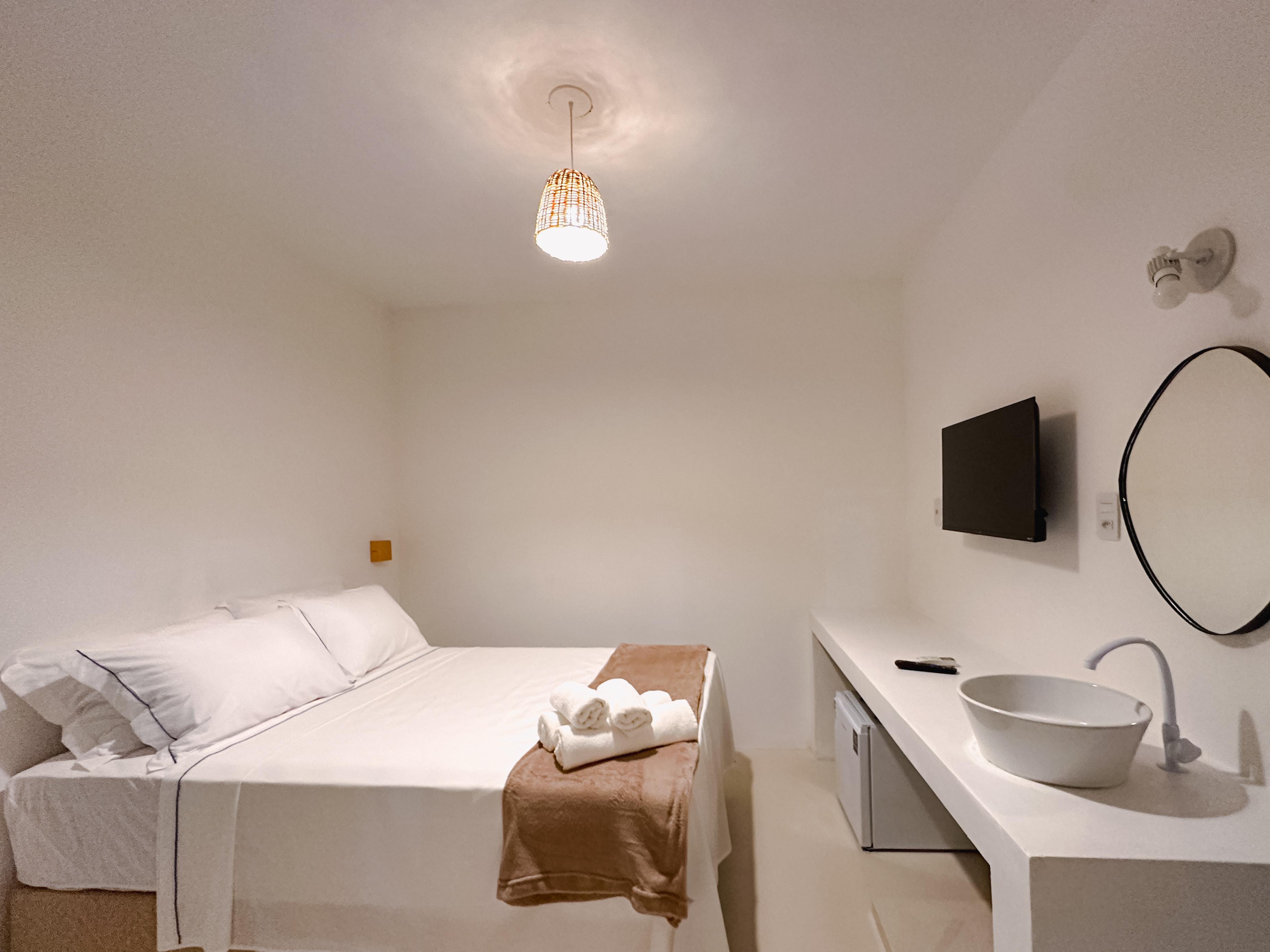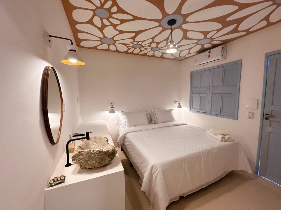 Nossa Suíte Master AH MAR, com 15m², é uma obra de arte praiana, ideal para casais. Com sacada privativa, balanço, Smart TV 55", espelho rústico, luminárias de luz quente e vista para a piscina e pracinha charmosa, oferece aconchego e charme em cada detalhe. Um refúgio perfeito em Arraial d'Ajuda!